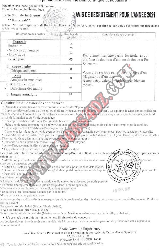 تعلنالمدرسة العليا للاساتذة ببوزريعة الجزائر العاصمة عن فتح مسابقات على اساس الشهادات للالتخاق بالرتب التالية
