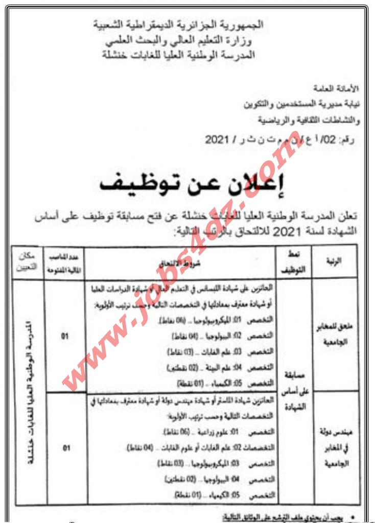 تعلن المدرسة الوطنية العليا للغابات عن فتح مسابقة على اساس الشهادة لسنة 2021 للإلتحاق بالمناصب التالية