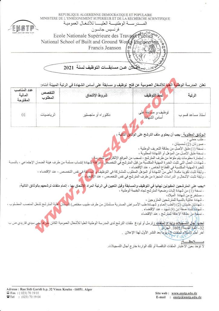 تعلن المدرسة الوطنية العليا للأشغال العمومية بالقبة القديمة بالجزائر العاصمة عن توظيف على أساس الشهادة في المناصب التالية