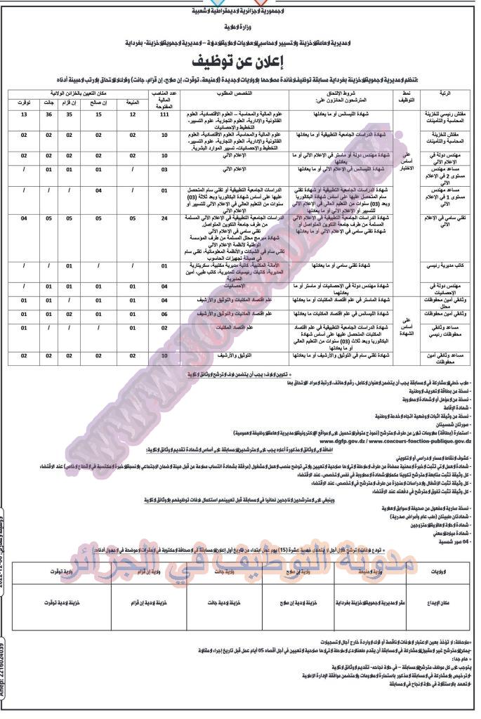 تنظم المديرية الجهوية للخزينة بغرداية مسابقة توظيف لفائدة الولايات الجديدة المنيعة توقرت عين صالح عين قزام جانت عن فتح مسابقة توظيف على اساس الشهادة وعلى اساس الاختبار تنظم في الرتب المبينة ادناه
