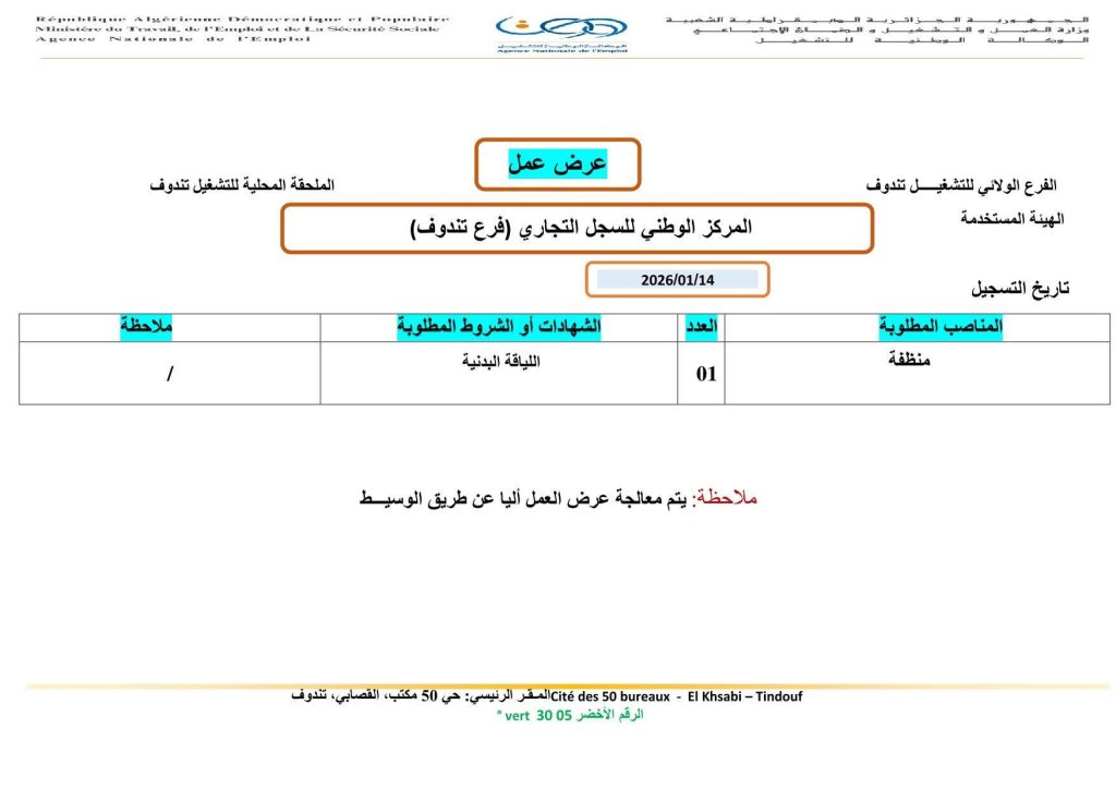 الهيئة المستخدمة: المركز الوطني للسجل التجاري (فرع تندوف)