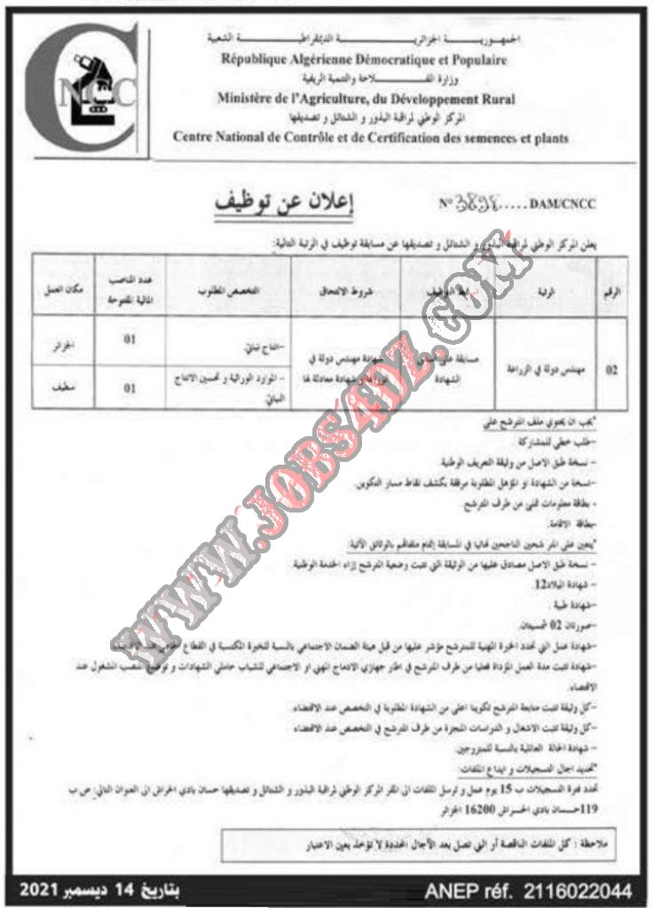 اعلان توظيف بالمركز الوطني لمراقبة البذور والشتائل وتصديقها بالجزائر العاصمة