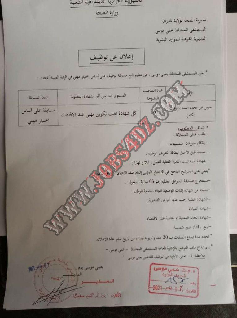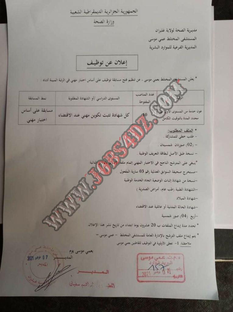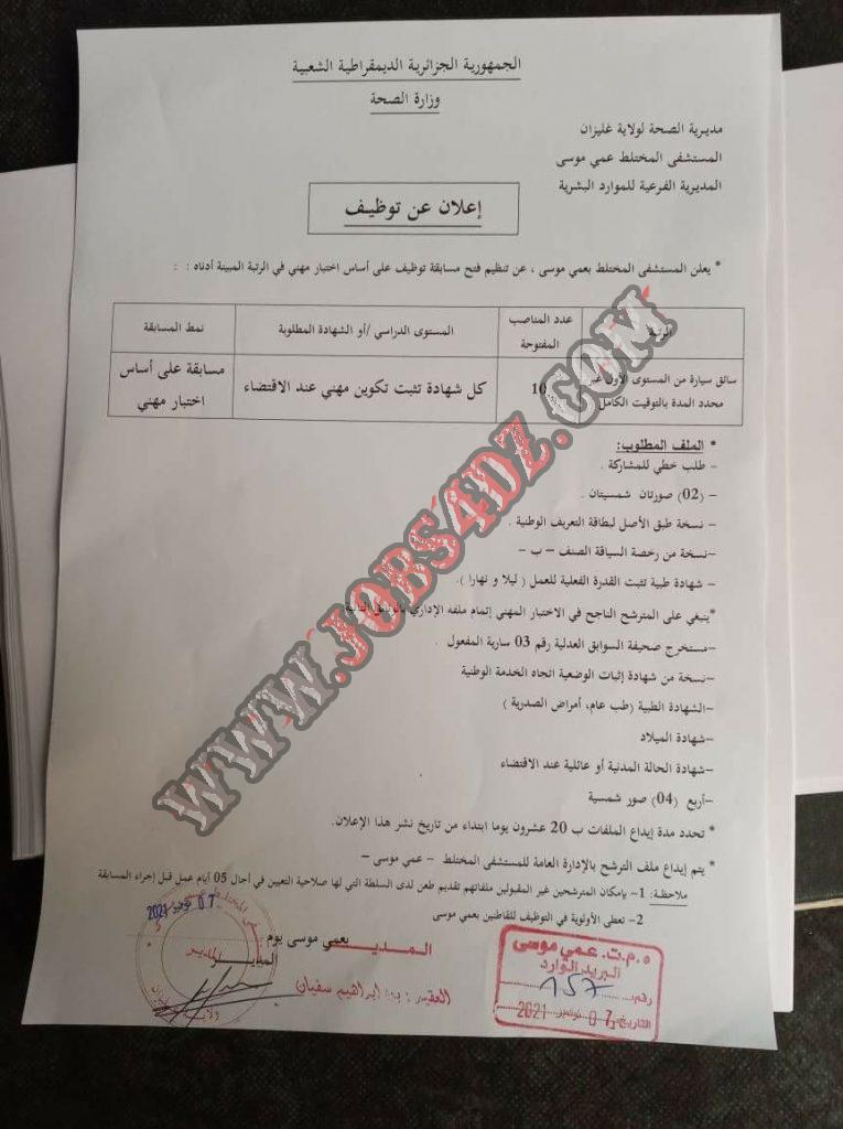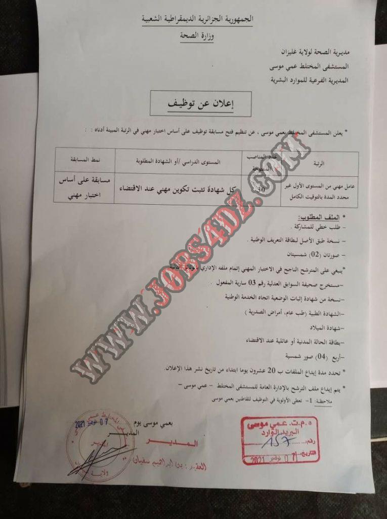 يعلن المستشفى المختلط عمي موسى ولاية غليزان عن فتح مسابقات توظيف على اساس الاختبارات في المناصب المبينة ادناه