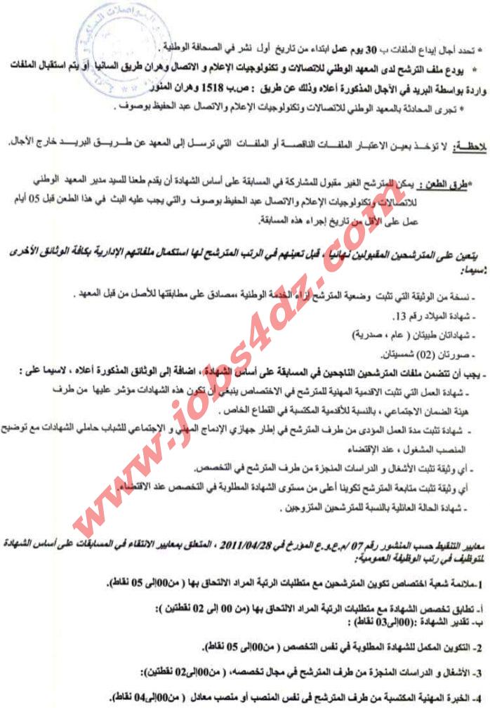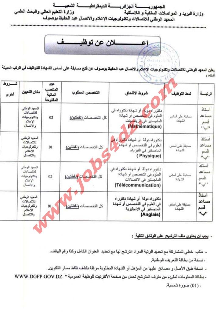 يعلن المعهد الوطني للاتصالات وتكنولوجيات الاعلام والاتصال عبد الحفيظ بوصوف عن فتح مسابقة على اساس الشهادة للتوظيف في الرتب المبينة ادناه
