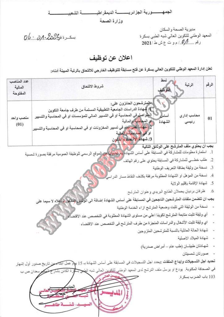 تعلن المعهد الوطني للتكوين العالي بولاية بسكرة عن فتح مسابقة توظيف على اساس الشهادة في المناصب التالية