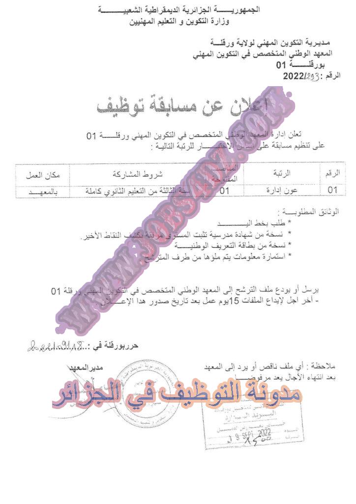 اعلان توظيف بالمعهد الوطني المتخصص في التكوين المهني ورقلة 01