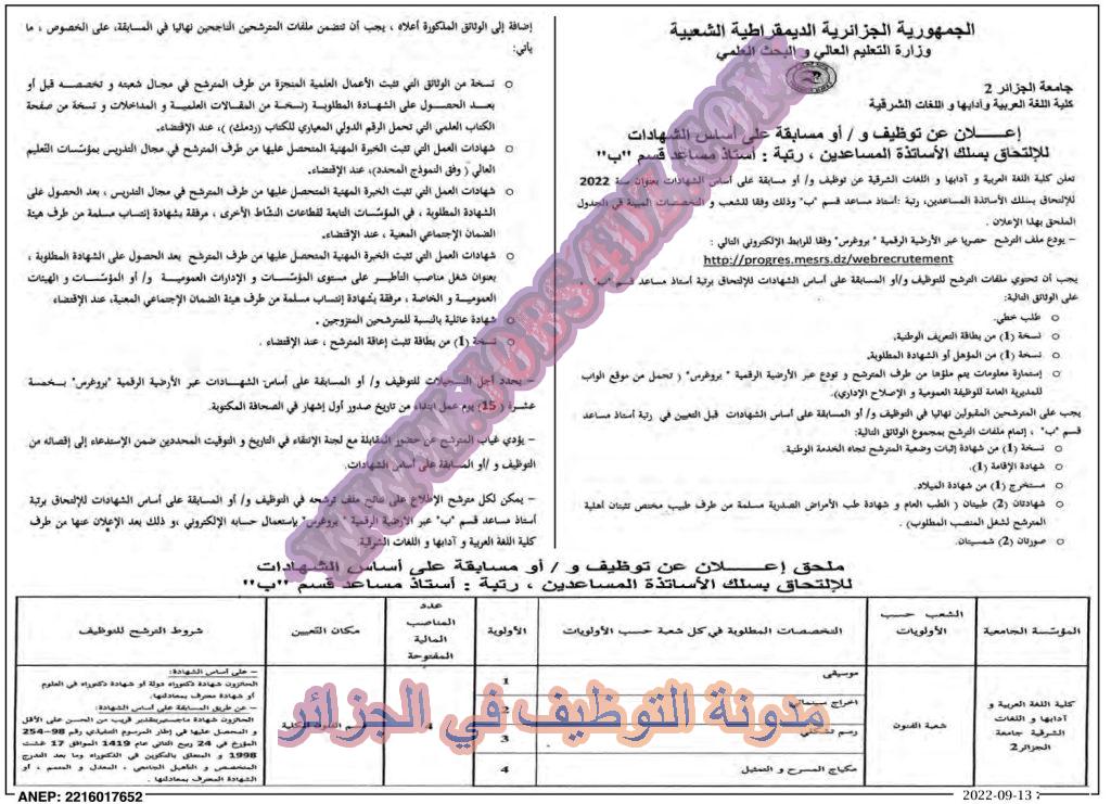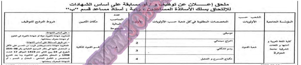 تعلن كلية الللغة العربية وادابها واللغات الشرقية عن فتح مسابقة توظيف على اساس الشهادة بعنوان السنة المالية 2022 في المناصب المبينة ادناه