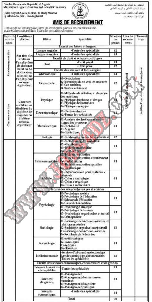 يعلن مدير جامعة تامنغست عن فتح مسابقة للتوظيف في رتبة استاذ مياعد قسم ب حسب ماهو مبين ادناه
