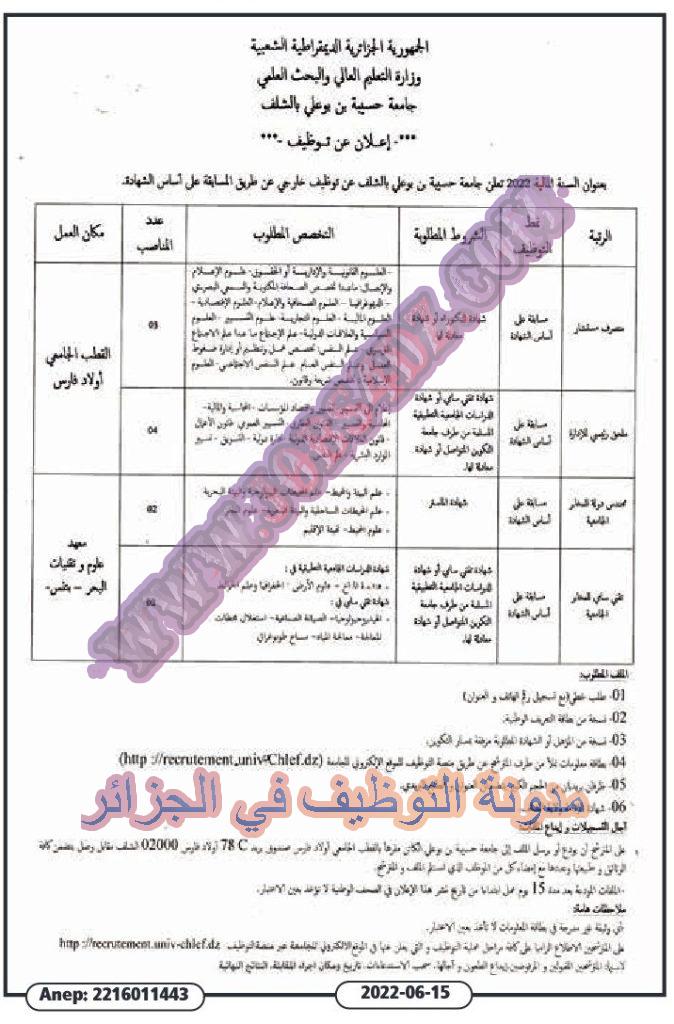 تعلن جامعة حسيبة بن بوعلي بالشلف عن فتح مسابقة توظيف على اساس الشهادة بعنوان السنة المالية 2022 في المناصب المبينة ادناه