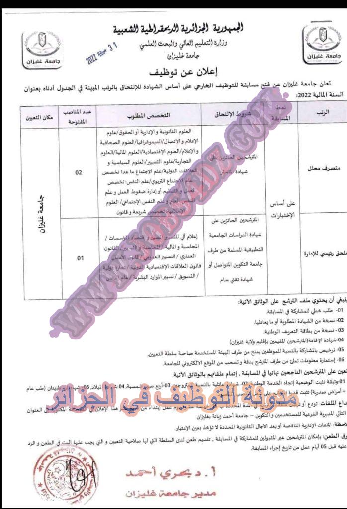 تعلن جامعة غليزان عن فتح مسابقة توظيف على اساس الاختبارات بعنوان السنة المالية 2022 في المناصب المبينة ادناه