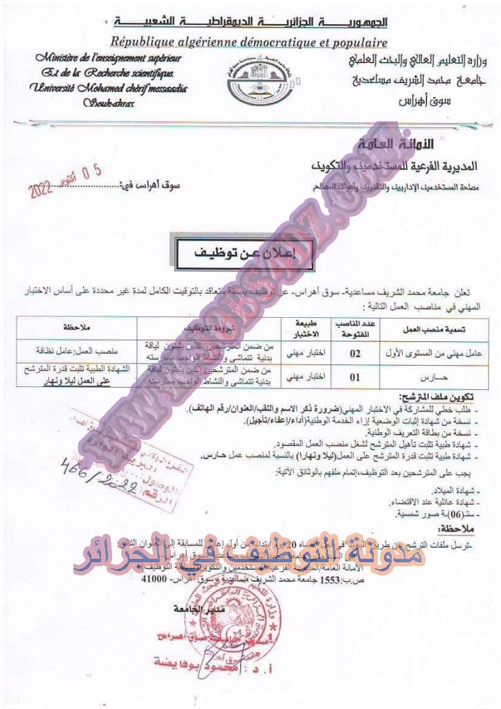 تعلن جامعة محمد الشريف مساعدية سوق اهراس عن فتح مسابقة توظيف على اساس الاختبار المهني في الرتب المبينة ادناه