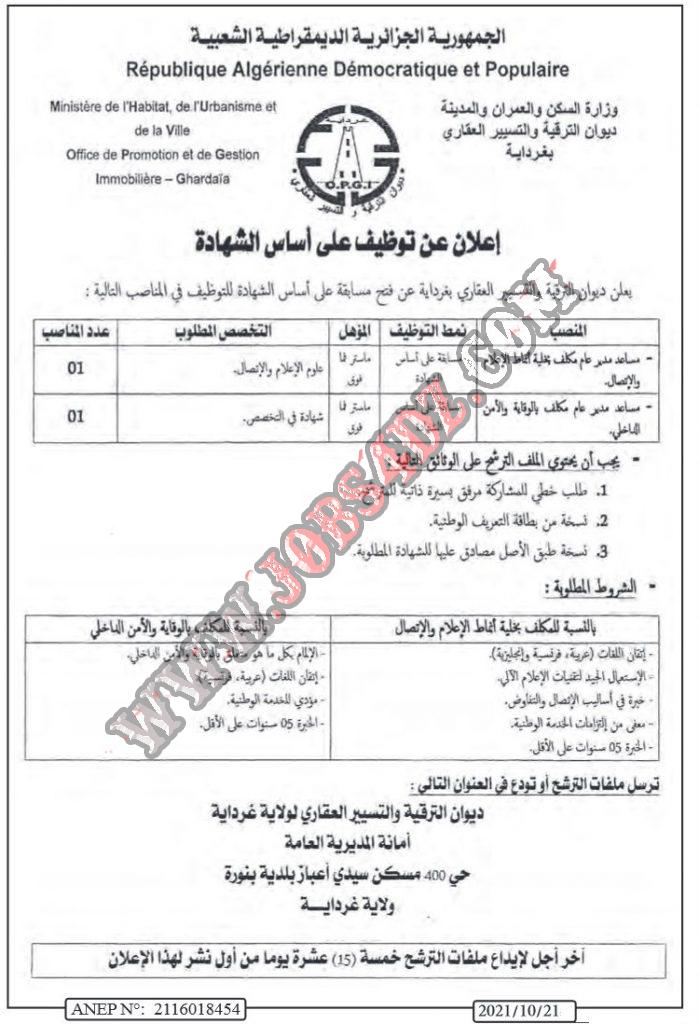 يعلن ديوان الترقية والتسيير العقاري بولاية غرداية عن فتح مسابقة على اساس الشهادة للتوظيف في المناصب التالية