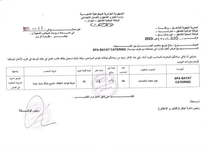 تعلن الوكالة المحلية للتشغيل عين صالح عن عرض عمل بشركة الاطعام و الفندقة bayat catering كما هو موضح ادناه