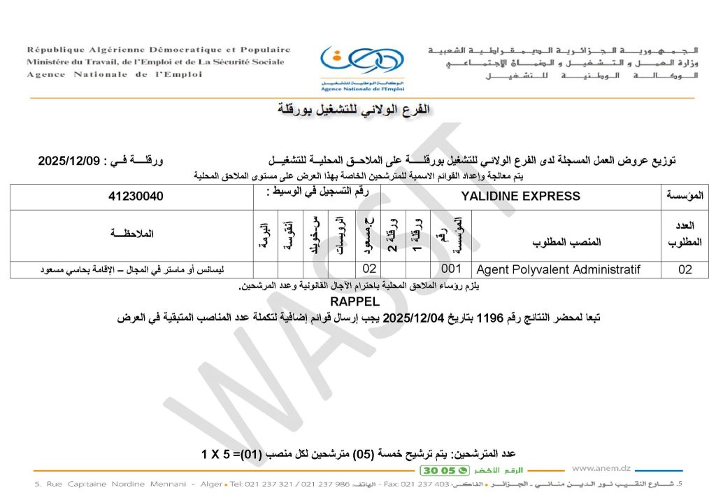 | YALIDINE EXPRESS | 02 | Agent Polyvalent Administratif |