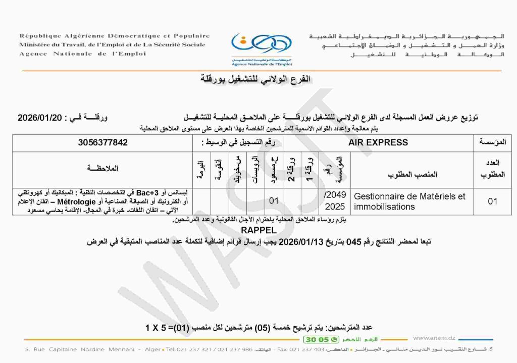 AIR EXPRESSGestionnaire de Matériels et immobilisations01ليسانس أو Bac+3 في التخصصات التقنية : الميكانيك أو كهر وتقني أو إلكترونيك أو الصيانة الصناعية أو Métrologie – اتقان الإعلام الآلي – اتقان اللغات – خبرة في المجال – الإقامة بحاسي مسعود