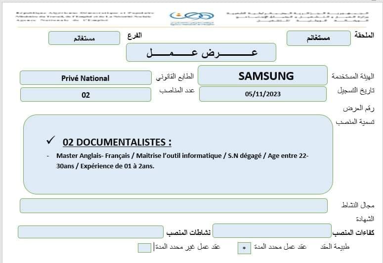 تعلن الملحقة المحلية للتشغيل مستغانم عرض عمل بشركة سامسونغ SAMSUNG كما هو موضح ادناه