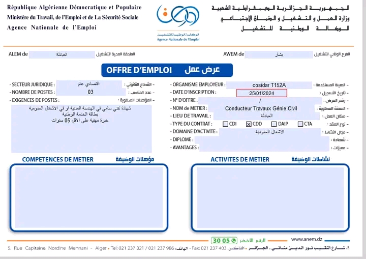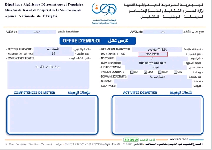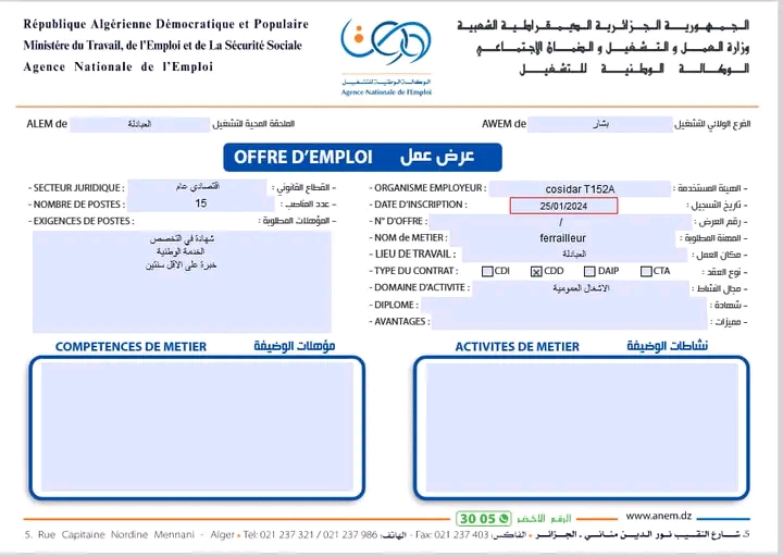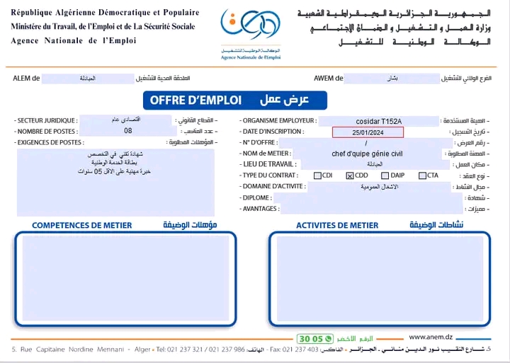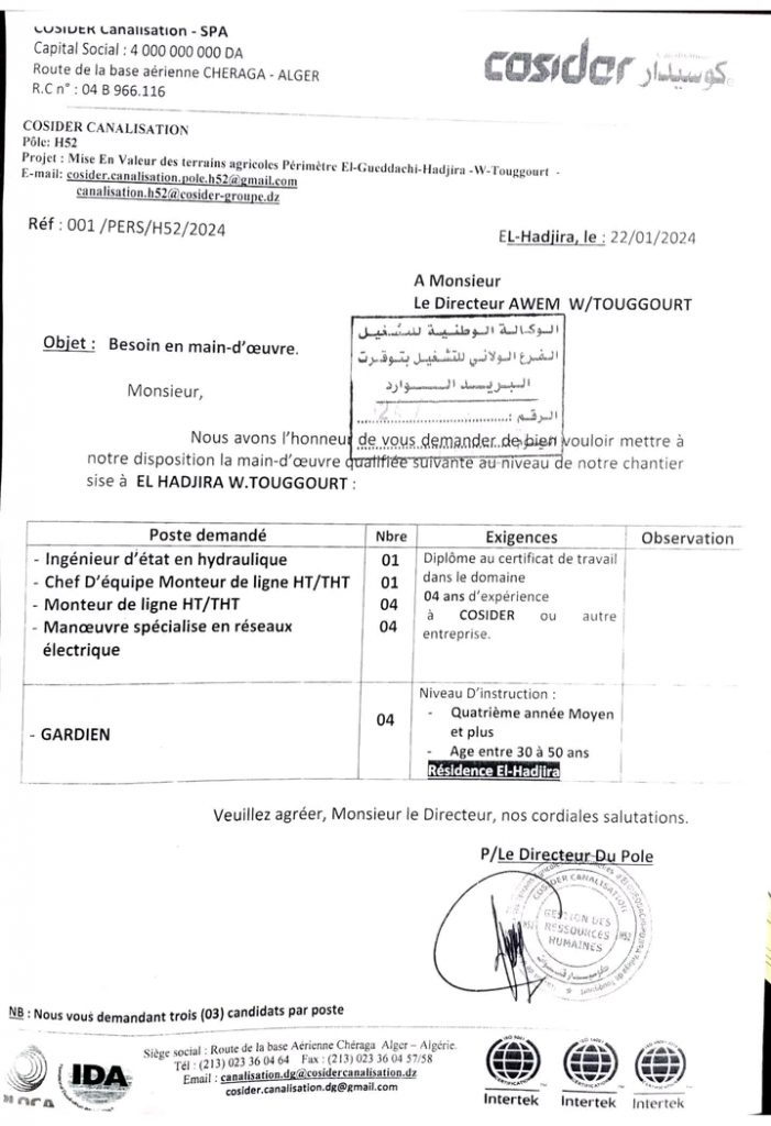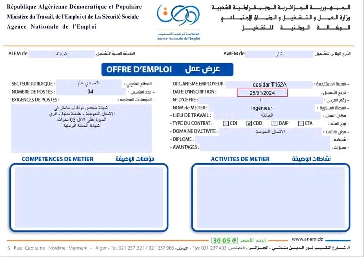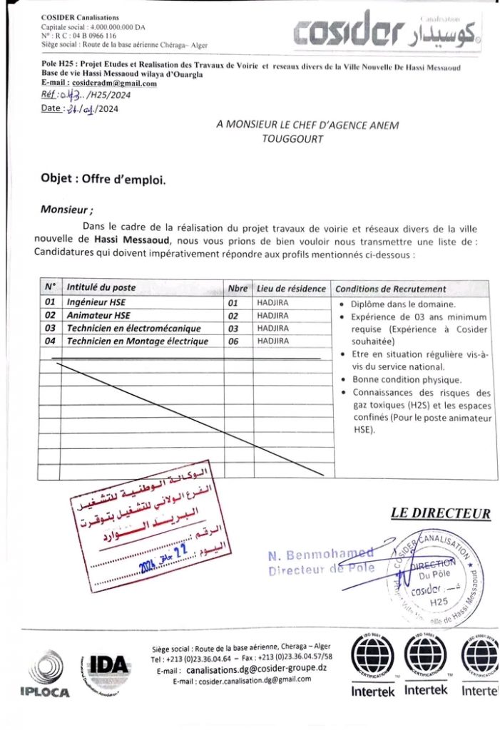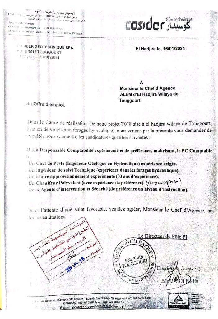 تعلن الملحقة المحلية للتشغيل العبادلة عن عرض عمل بشركة كوسيدار Cosider كما هو موضح ادناه