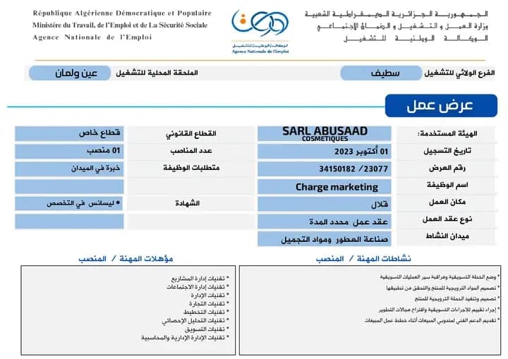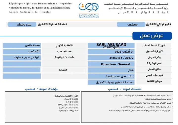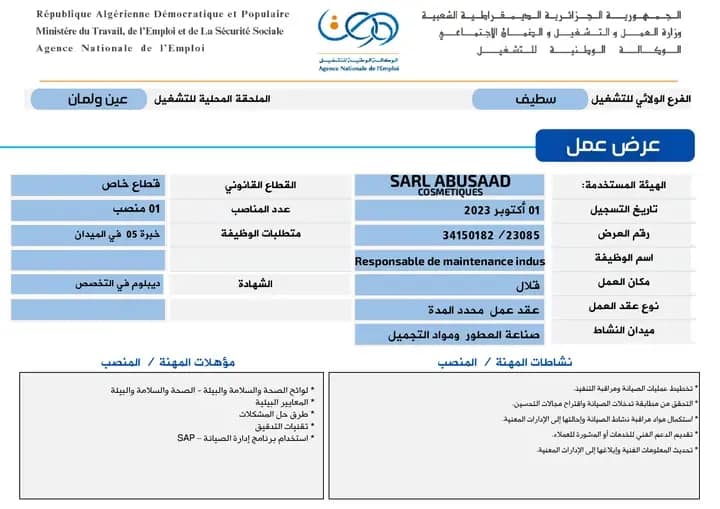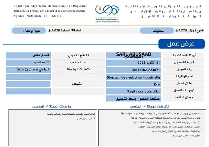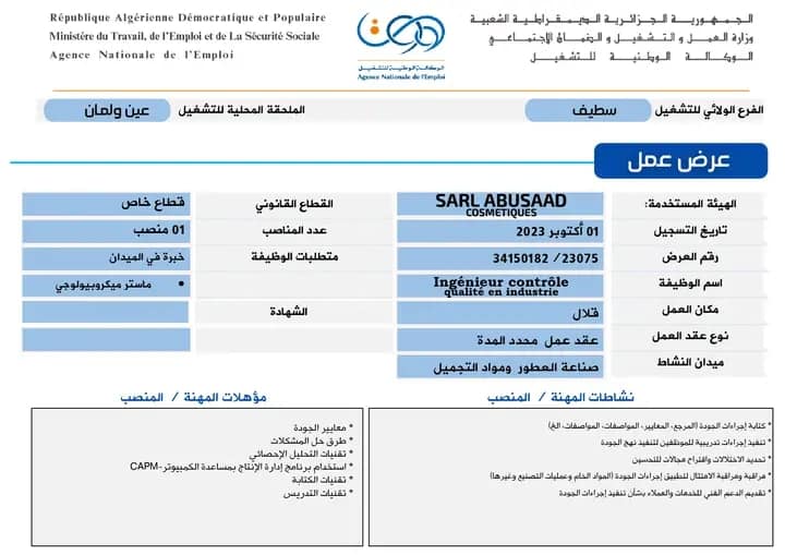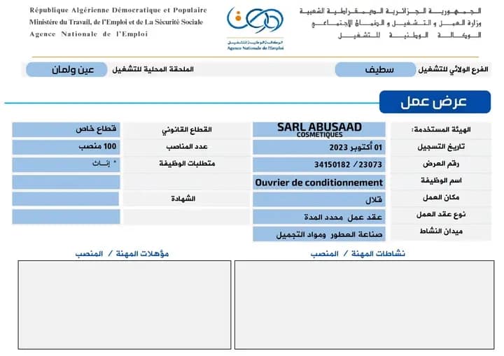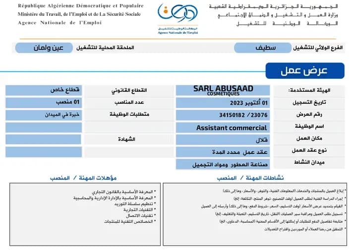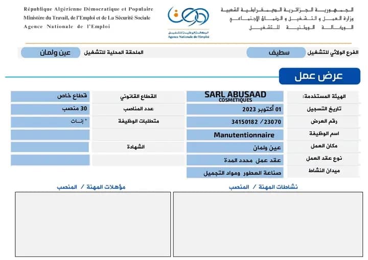 تعلن الملحقة المحلية للتشغيل عين ولمان سطيف عرض عمل بمؤسسة ابوسعد كوسميتيك كما هو موضح ادناه