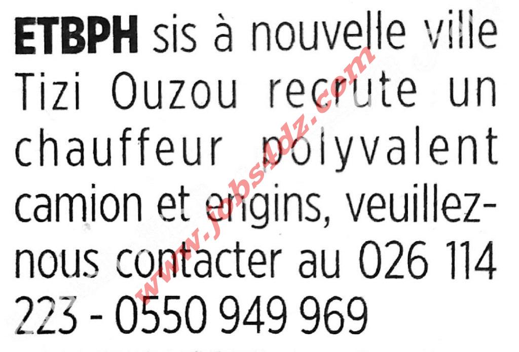 مؤسسة ETBPH المتواجدة بالمدينة الجديدة بتيزي وزو توظف :