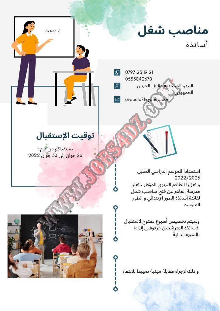 استعدادا للموسم الدراسي الجديد 2022/2023 وتعزيزا للطاقم التربوي المؤطر تعلن مدرسة الماهر عن فتح مناصب شغل لفائدة اساتذة الطور الابتدائي والطور المتوسط