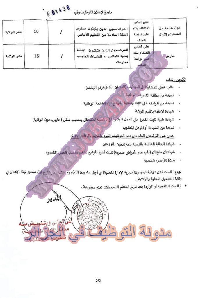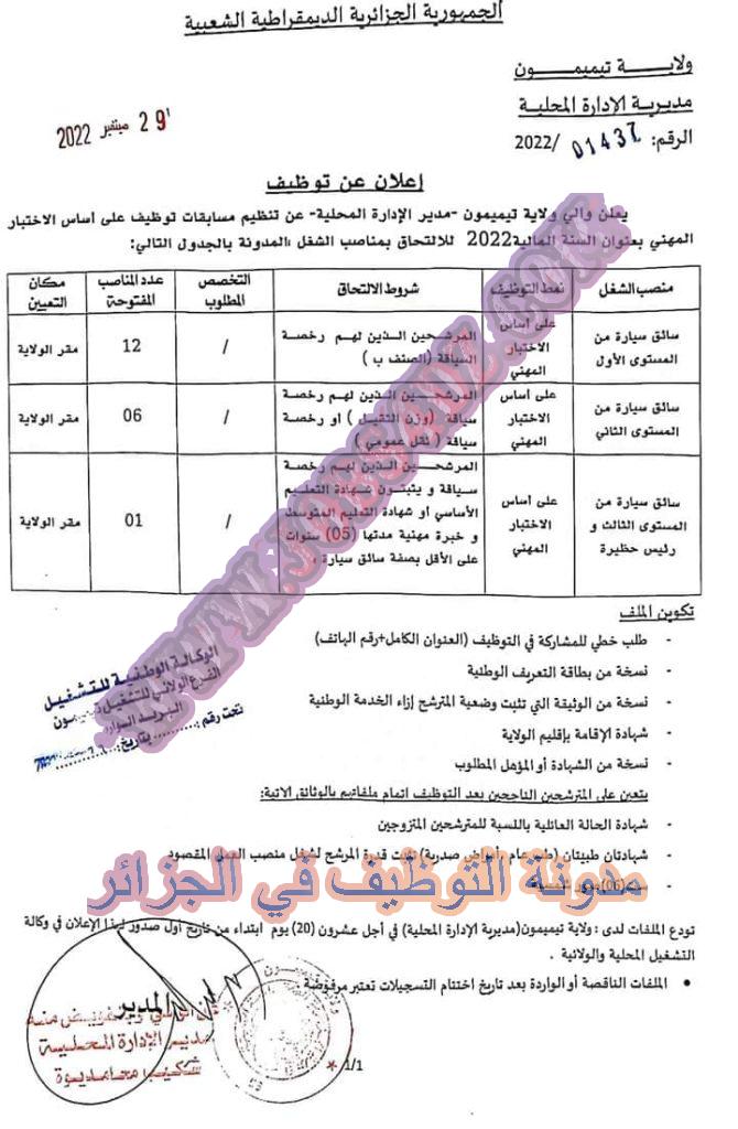 تعلن مديرية الادارة المحلية لولاية تيميمون عن فتح توظيف على اساس الاختبار المهني على اسسا الانتقاء الرتب المبينة ادناه
