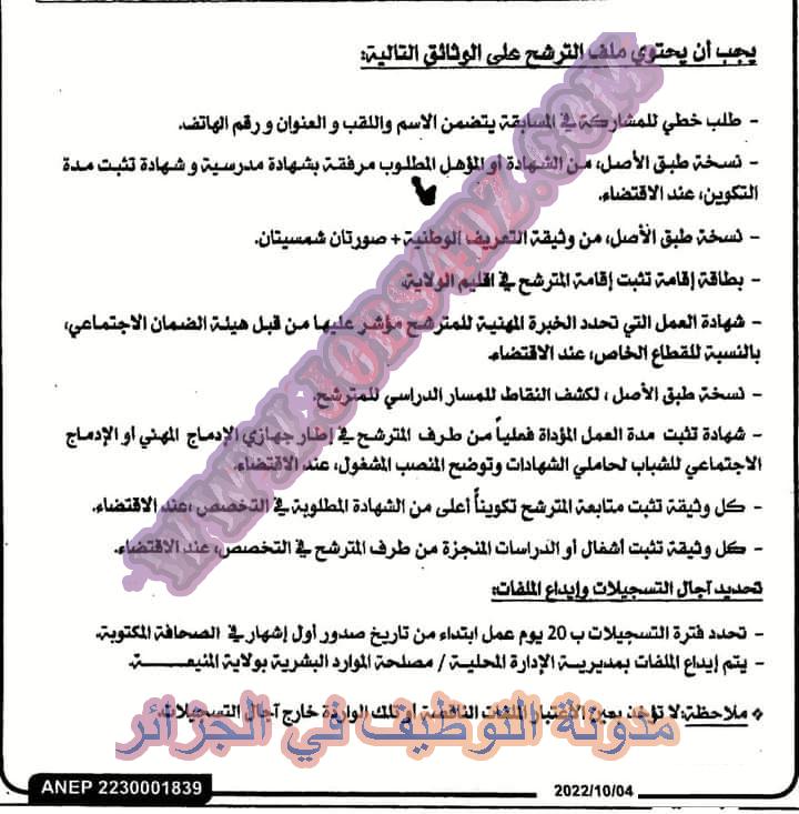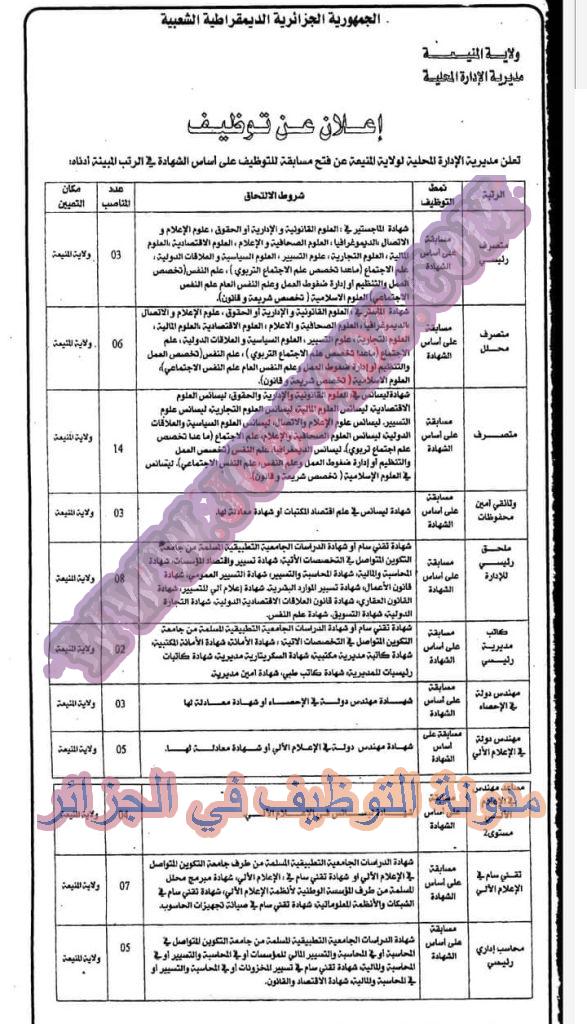 تعلن مديرية الادارة المحلية لولاية المنيعة عن فتح مسابقة توظيف على اساس الشهادة في الرتب المبينة ادناه