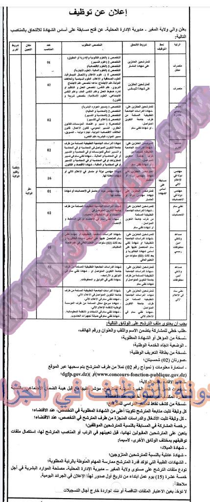 تعلن مديرية الادارة المحلية لولاية المغير عن فتح مسابقة توظيف على اساس الشهادة في الرتب المبينة ادناه