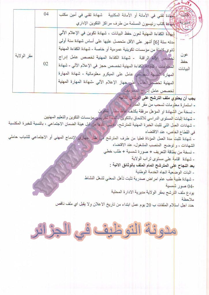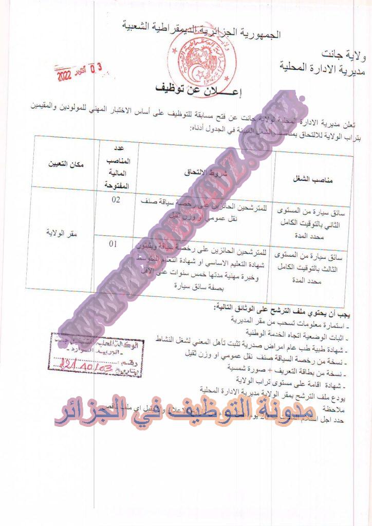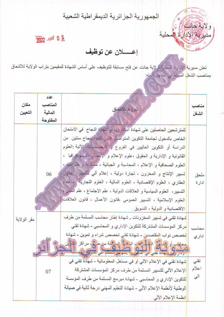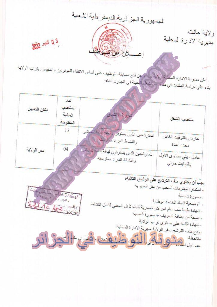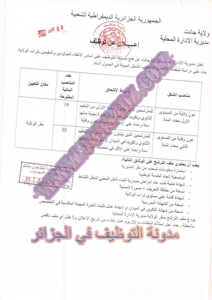 تعلن مديرية الادارة المحلية لولاية جانت عن فتح مسابقة توظيف على اساس الشهادة والاختبار المهني وعلى اساس الانتقاء في الرتب المبينة ادناه