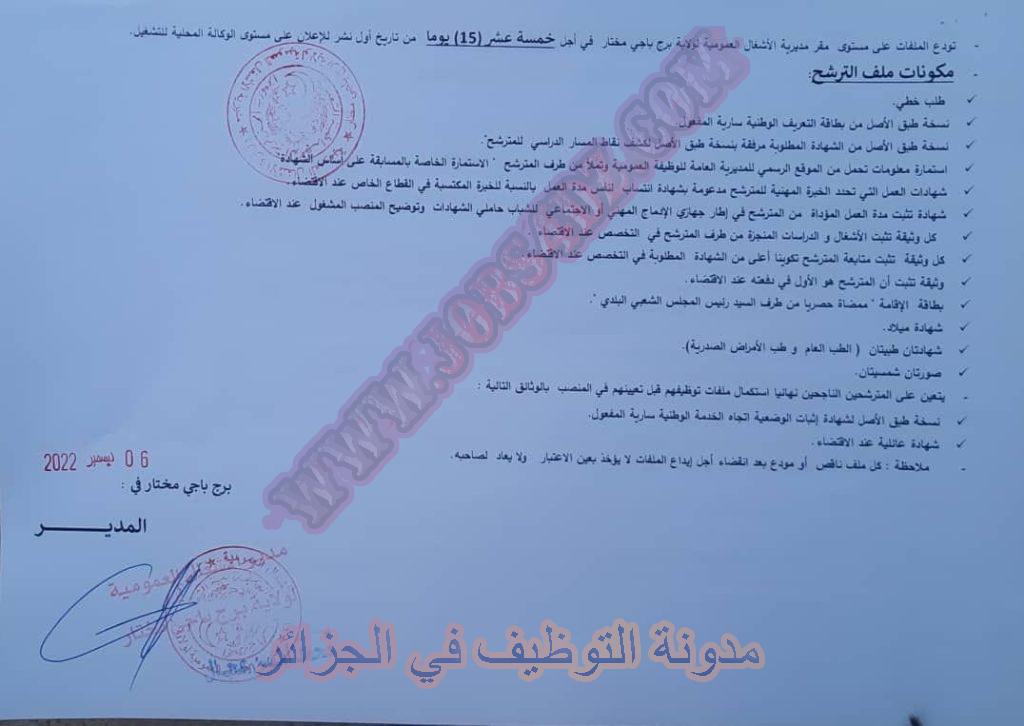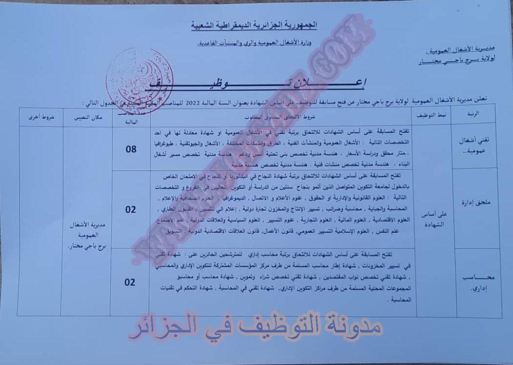تعلن مديرية الاشغال العمومية ولاية برج باجي مختار عن فتح مسابقة توظيف على اساس الشهادة في الرتب المبينة ادناه