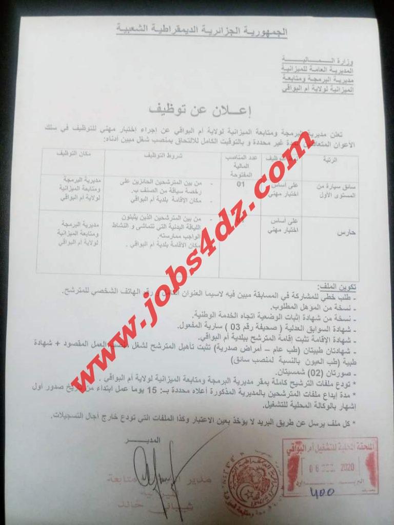 تعلن مديرية البرمجة ومتابعة الميزانية لولاية ام البواقس عن اجراء اختبار مهني للتوظيف في سلك الاعوان المتعاثدين لمدة غير محددة وبالتوقيت الكامل للالتحاق بمناصب الشغل التالية