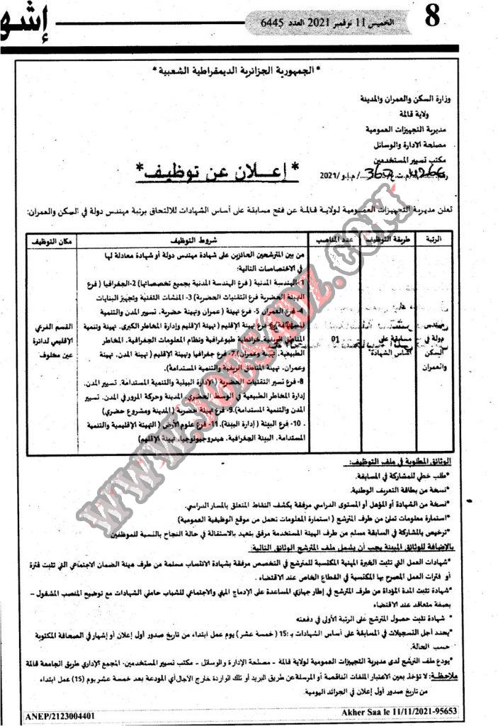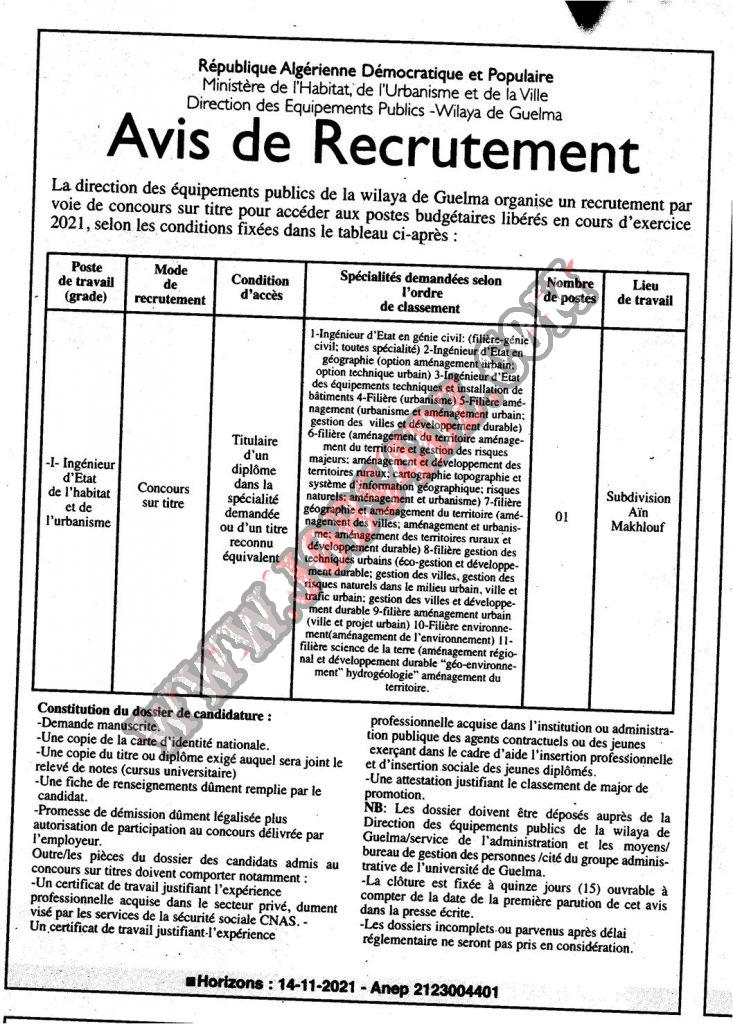 تعلن مديرية التجهيزات العمومية ولاية قالمة عن فتح مسابقة على اساس الشهادات للالتحاق بالرتبة المبينة ادناه