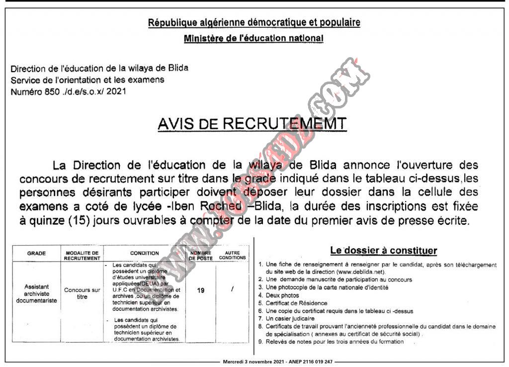 تعلن مديرية التربية لولاية البليدة عن مسابقات التوظيف على اساس الشهادة في المناصب المبينة ادناه