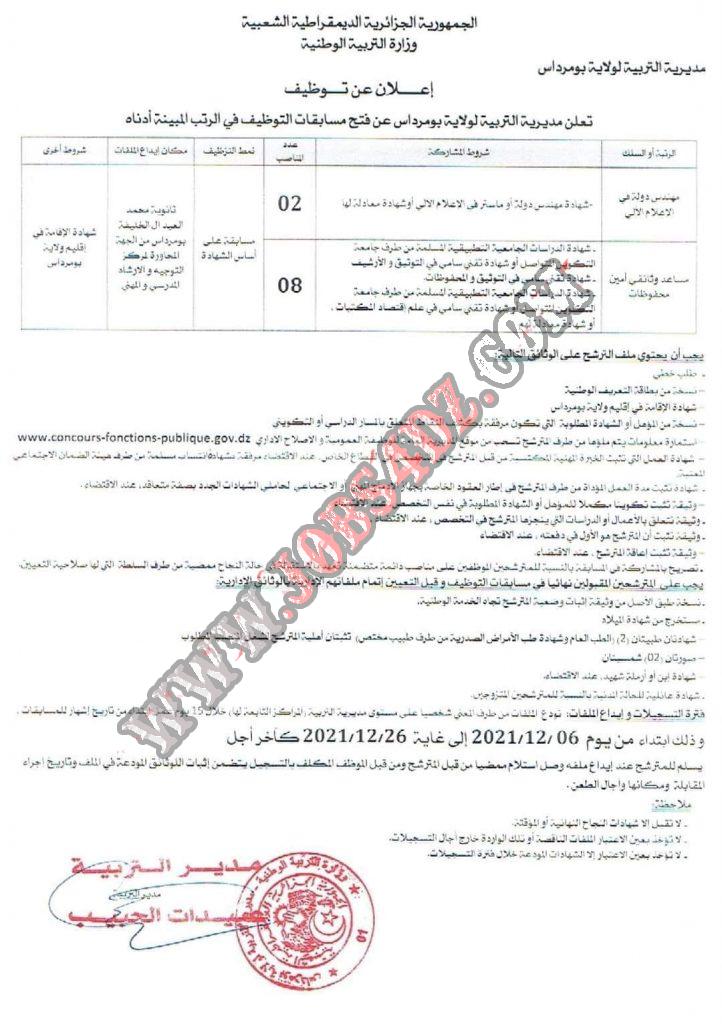 تعلن مديرية التربية لولاية بومرداس عن فتح مسابقات للتوظيف في الرتب المبينة ادناه