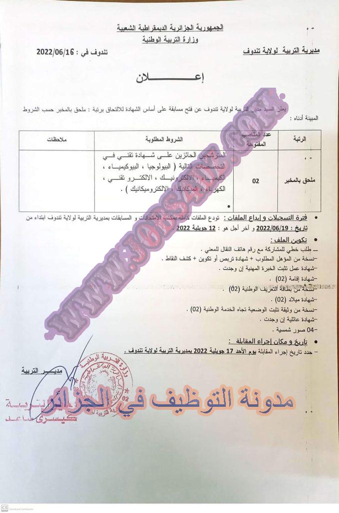 اعلان توظيف بمديرية التربية لولاية تندوف