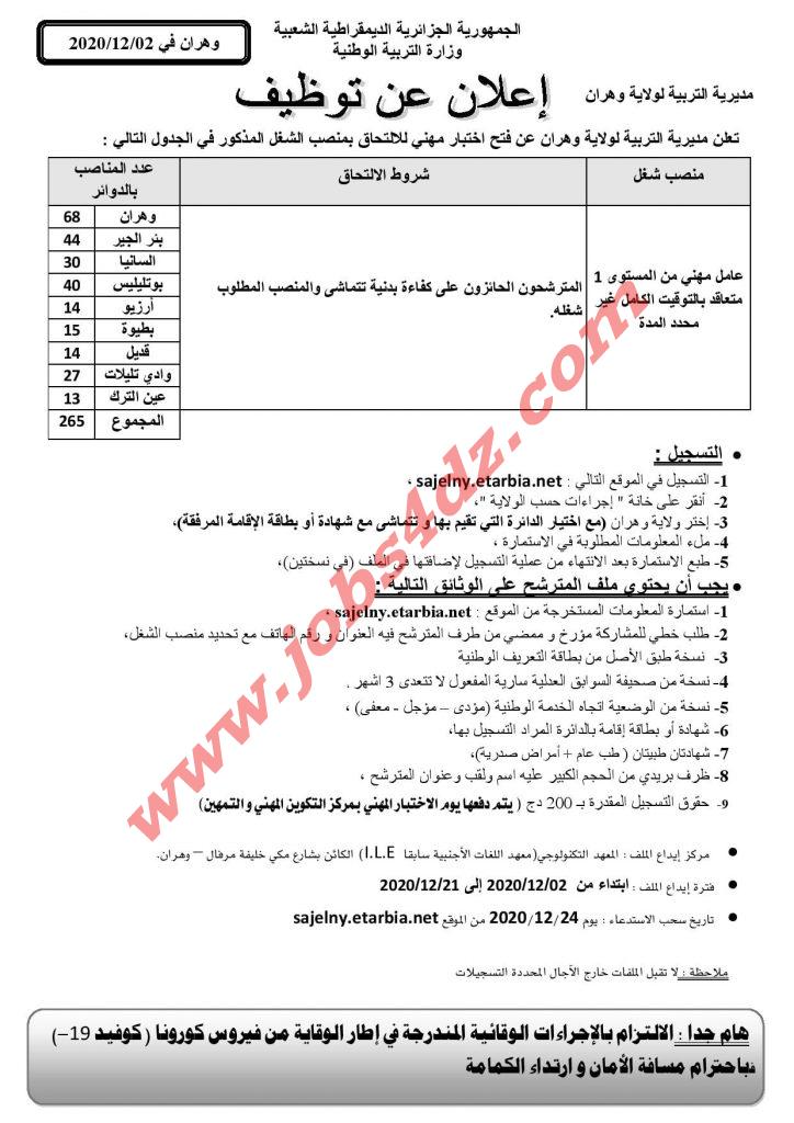 عامل مهني من المستوى 1 متعاقد بالتوقيت الكامل غير محدد المدة- 265 منصب