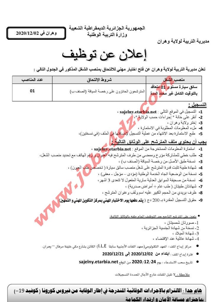 سائق سيارة مستوى 01 متعاقد بالتوقيت الكامل غير محدد المدة. عدد المناصب: 01 منصب.