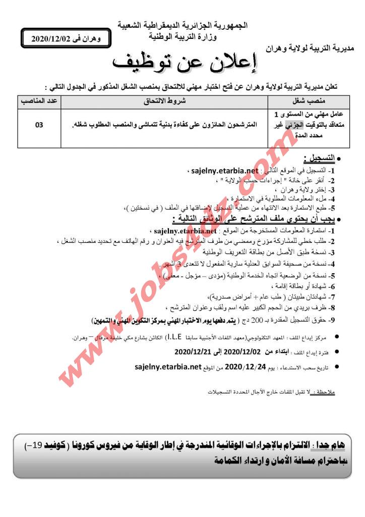 عامل مهني من المستوى 1 متعاقد بالتوقيت الجزئي غير محدد المدة- 03 مناصب