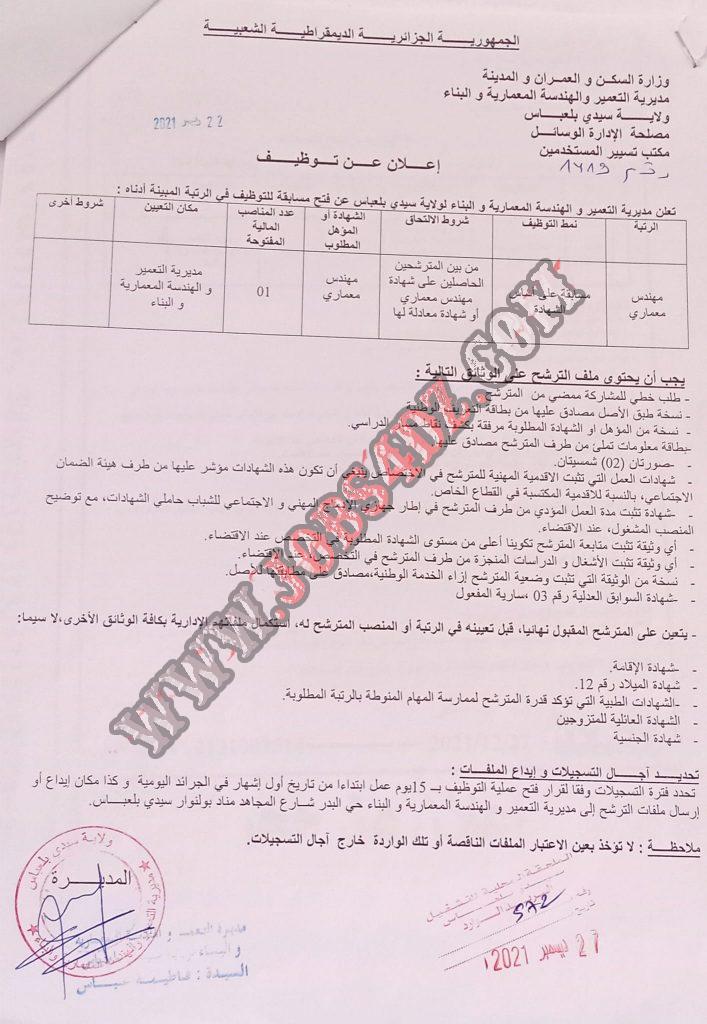 تعلن مديرية التعمير والهندسة المعمارية والبناء لولاية سيدي بلعباس عن فتح مسابقة توظيف على اساس الشهادات في المناصب التالية