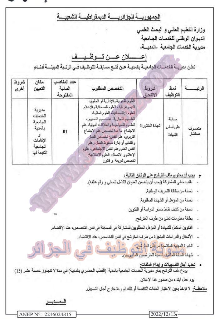 تعلن مديرية الخدمات الجامعية لولاية المدية عن فتح مسابقة توظيف على اساس الشهادة في الرتب المبينة ادناه