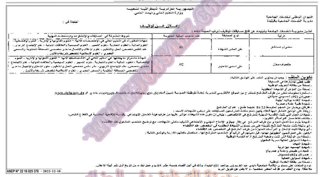 تعلن مديرية الخدمات الجامعية بولاية البليدة عن فتح مسابقة توظيف على اساس الشهادة في الرتب المبينة ادناه