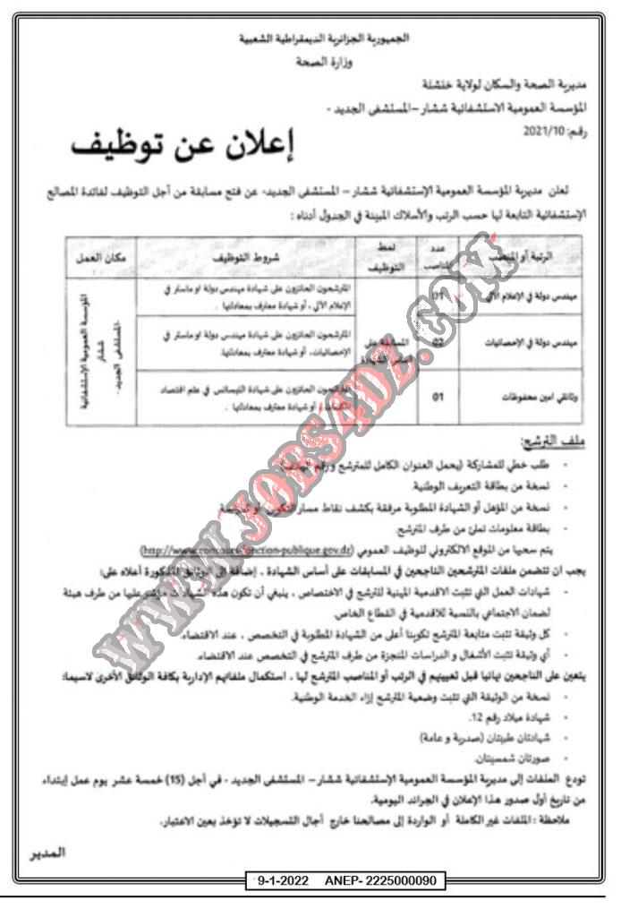 تعلن المؤسسة العمومية الاستشفائية ششار المستشفى الجديد خنشلة عن فتح مسابقة توظيف على اساس الشهادة في المناصب التالية