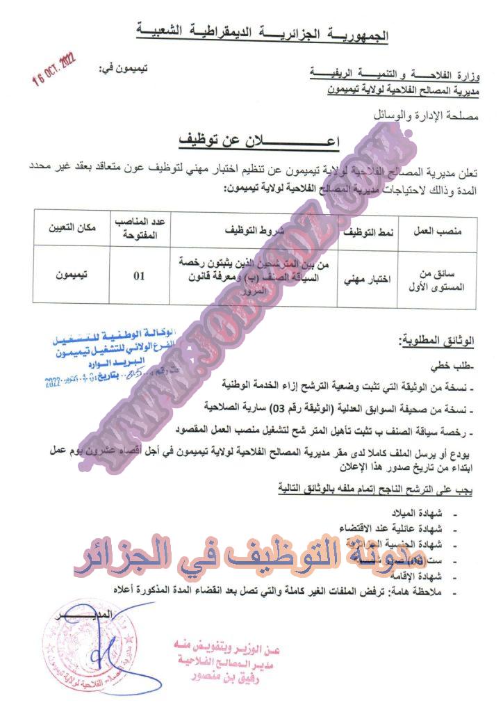 تعلن مديرية المصالح الفلاحية لولاية تيميمون عن فتح توظيف على اساس الاختبار المهني في الرتب المبينة ادناه