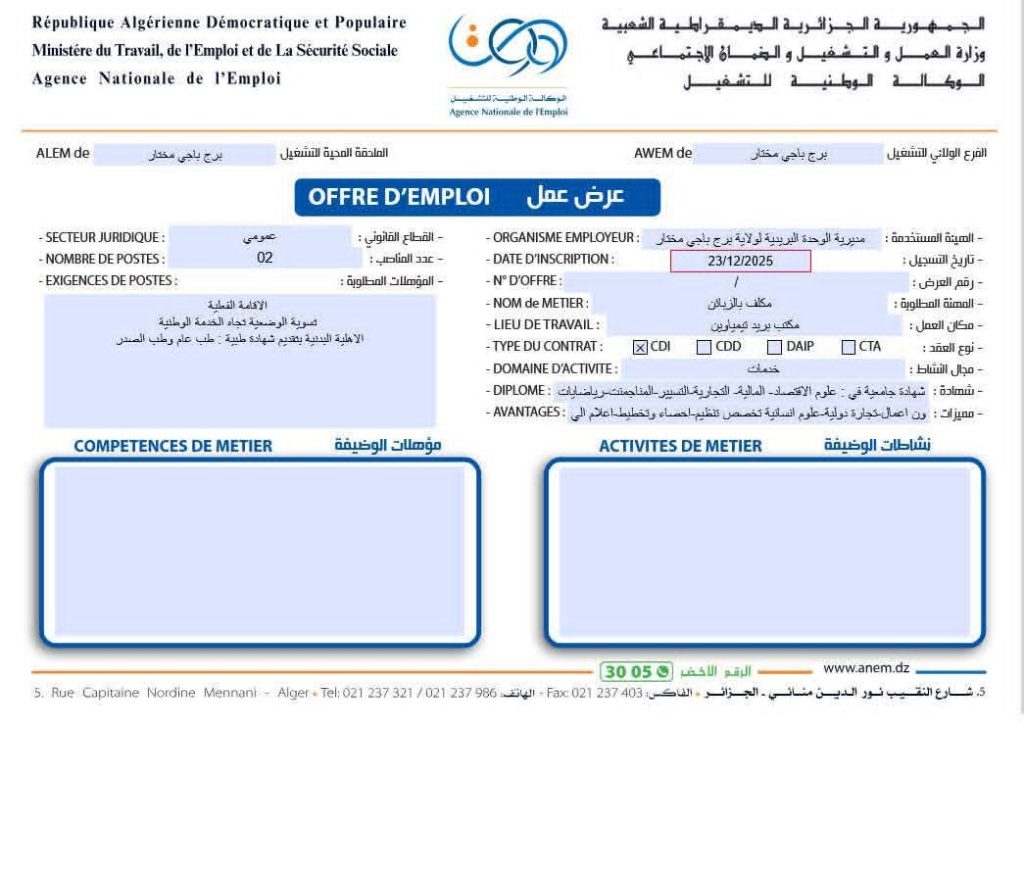 الهيئة المستخدمة: مديرية الوحدة البريدية لولاية برج باجي مختار