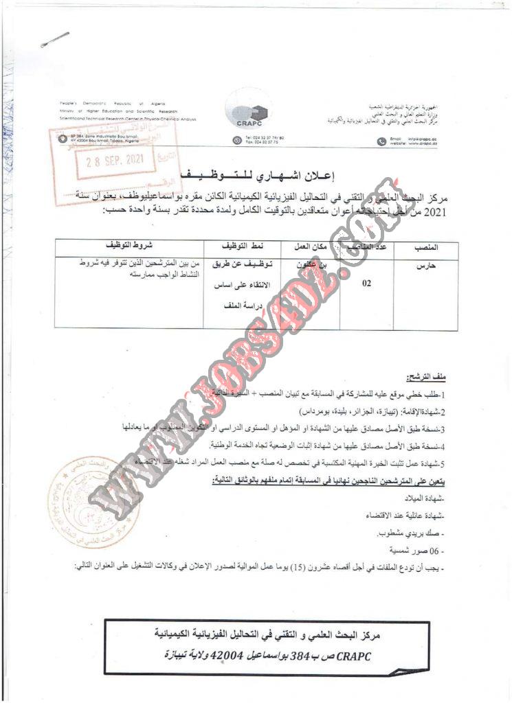 مركز البحث العلمي والتقني في التحاليل الفيزيائية الكيميائية الكائن مقره بواسماعيل يوظف بعنوان سنة 2021 من اجل احتبياجاته اعوان متعاقدين بالتوقيت الكامل ولمدة سنة كما و موضح ادناه
