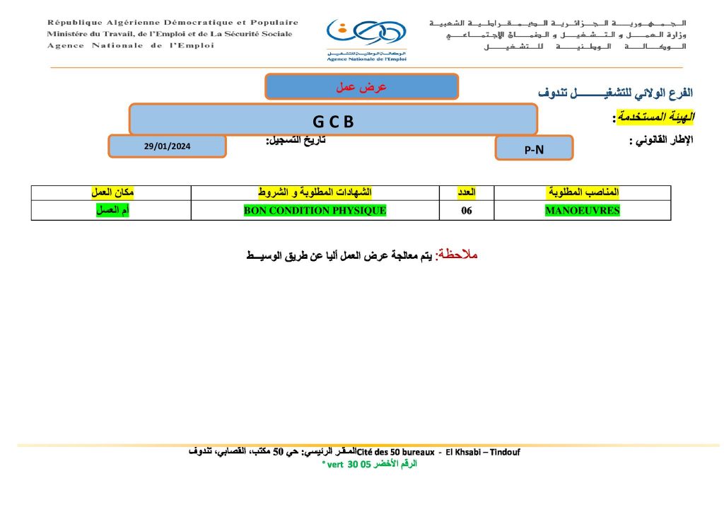 يعلن الفرع الولائي للتشغيل تندوف عن عرض عمل بالمؤسسة الوطنية للهندسة المدنية GCB كما هو موضح ادناه