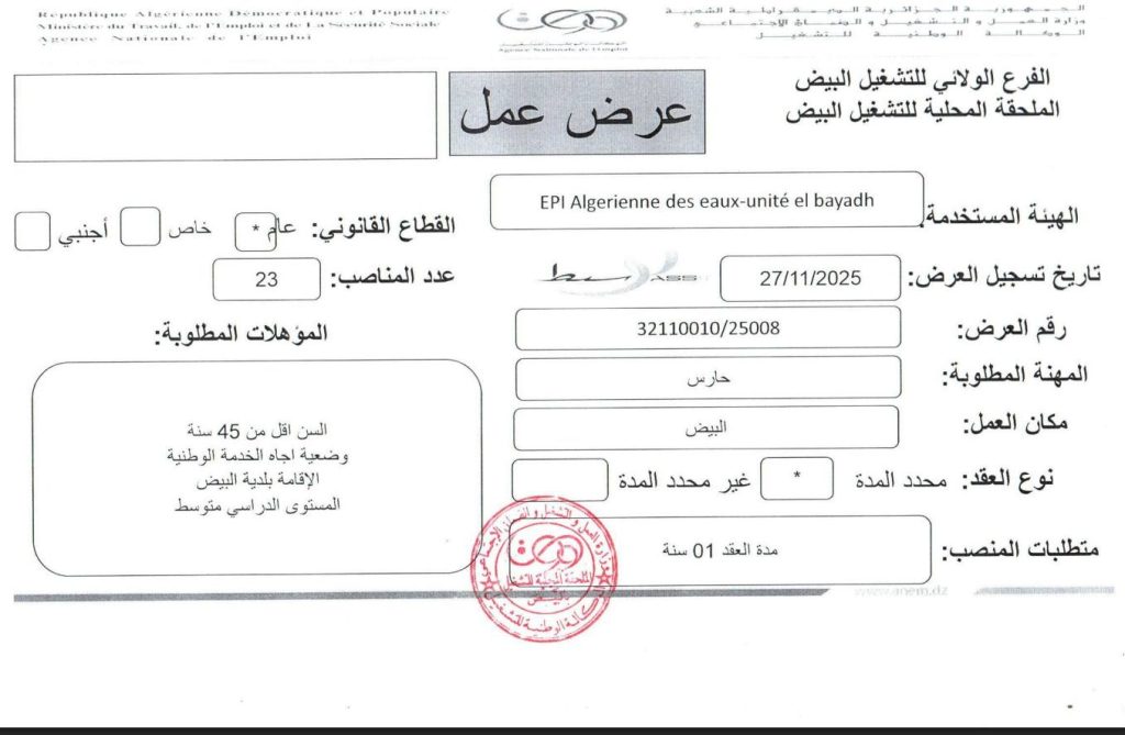 الهيئة المستخدمة: EPI Algérienne des eaux-unité el bayadh