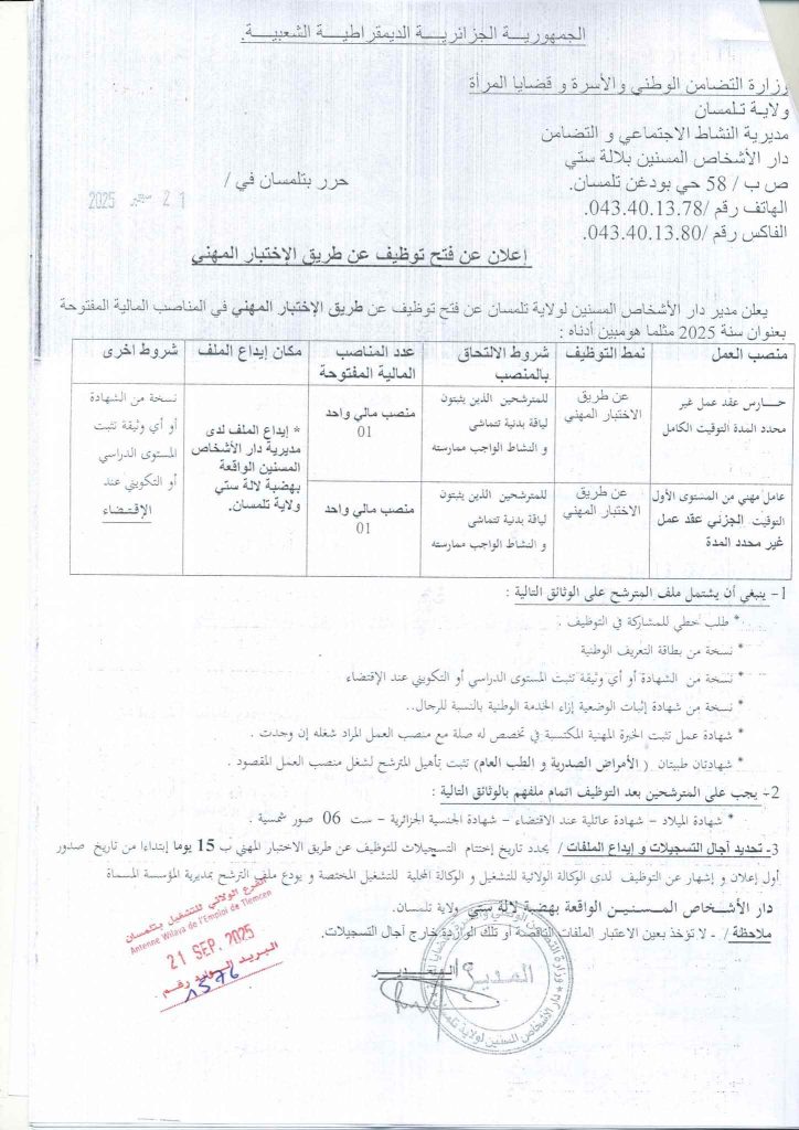 يعلن مدير دار الأشخاص المسنين بولاية تلمسان عن فتح توظيف عن طريق الإختبار المهني في المناصب المالية المفتوحة بعنوان سنة 2025 مثلما هو مبين أدناه: