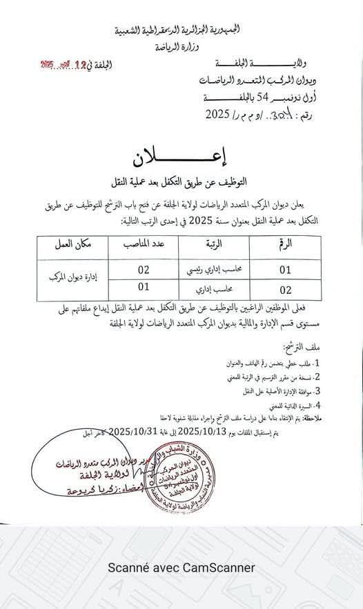 يعلن ديوان المركب المتعدد الرياضات لولاية الجلفة عن فتح باب الترشح للتوظيف عن طريق التكفل بعد عملية النقل بعنوان سنة 2025 في إحدى الرتب التالية: