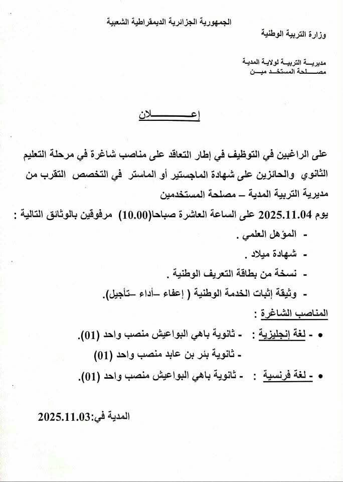 على الراغبين في التوظيف في إطار التعاقد على مناصب شاغرة في مرحلة التعليم الثانوي والحائزين على شهادة الماجستير أو الماستر في التخصص التقرب من مديرية التربية المدية – مصلحة المستخدمين يوم 2025.11.04 على الساعة العاشرة صباحاً (10.00) مرفوقين بالوثائق التالية: