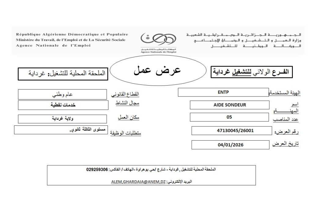 الملحقة المحلية للتشغيل، غرداية – شارع / حي بوهراوة – الهاتف / الفاكس: 029259306